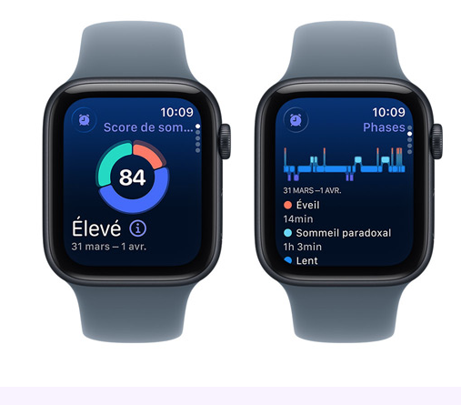 La qualité de vos nuits est influencée par plusieurs facteurs, comme votre temps de sommeil, la régularité de votre heure de coucher, la fréquence de vos réveils nocturnes et la durée de chaque phase de sommeil. La fonctionnalité Score de sommeil analyse ces paramètres chaque nuit et vous offre une classification assortie d’un score. Vous pouvez voir comment il est calculé, afin d’analyser la qualité de votre sommeil et d’en améliorer l’effet réparateur.