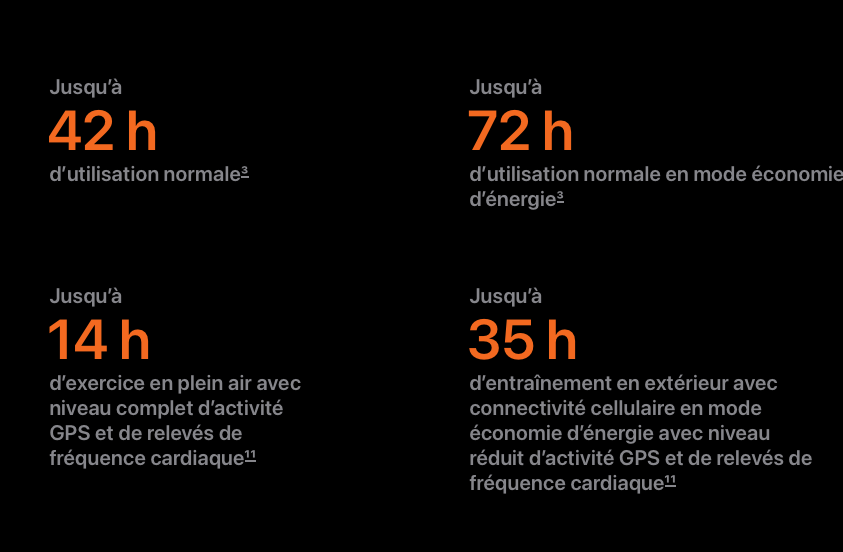L’Apple Watch Ultra 3 est conçue pour vous donner davantage d’autonomie et vous permettre de repousser encore vos limites. En cas de besoin, 15 minutes de charge rapide suffisent à vous offrir jusqu’à 12 heures d’utilisation normale.